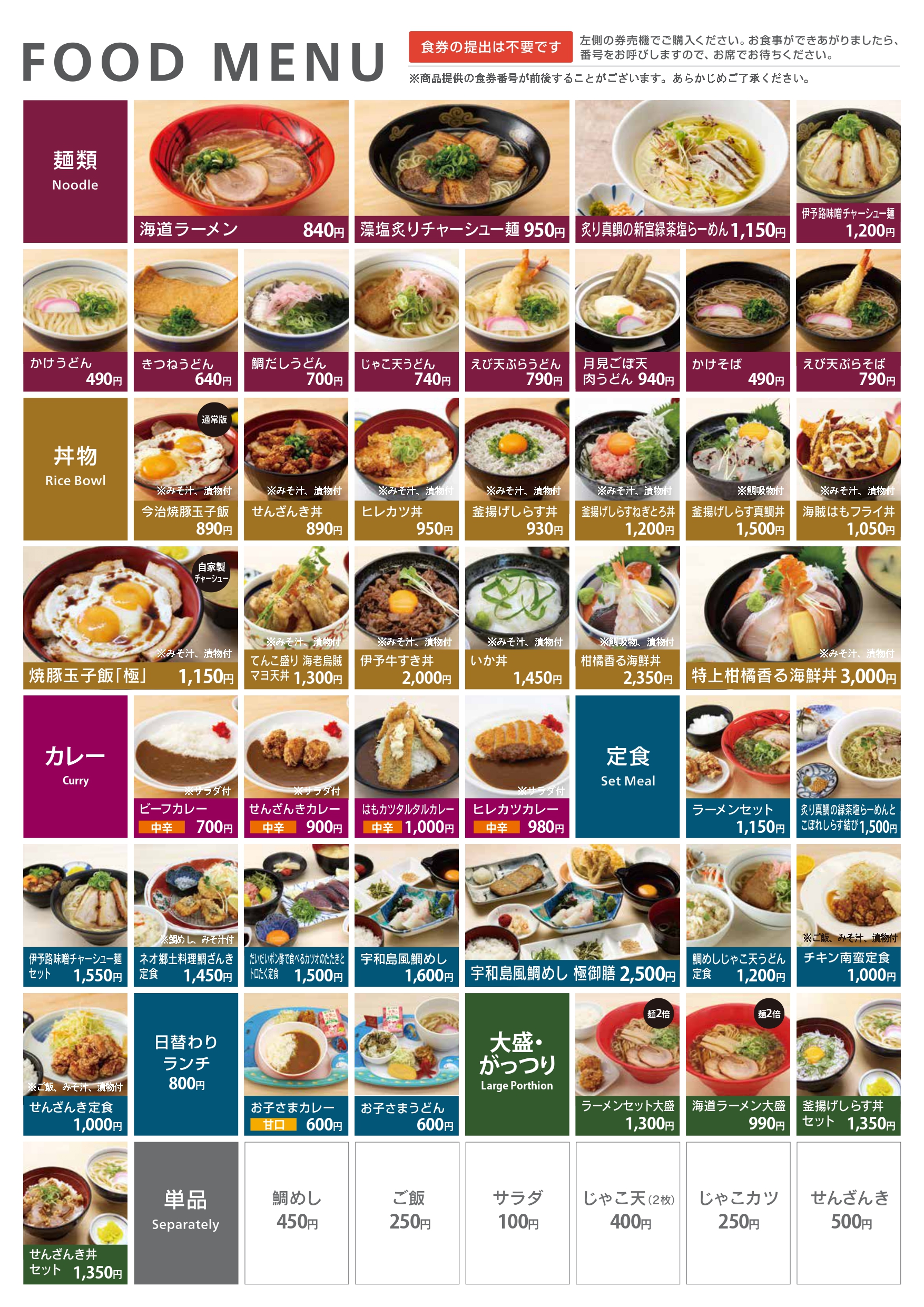 定番メニューから、季節限定メニュー、来島海峡サービスエリア限定メニューなど、