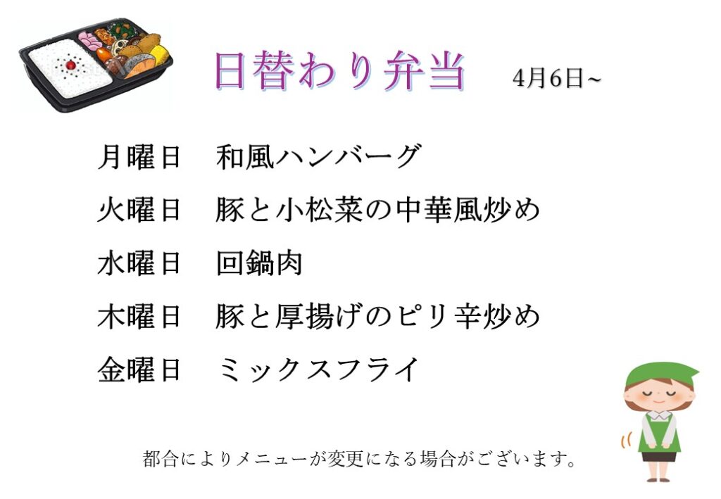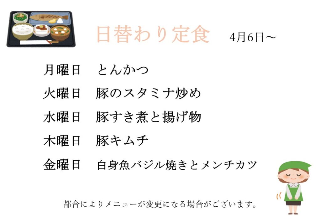 今週の「日替わり定食」と「日替わり弁当」のメニューをご紹介いたします。
