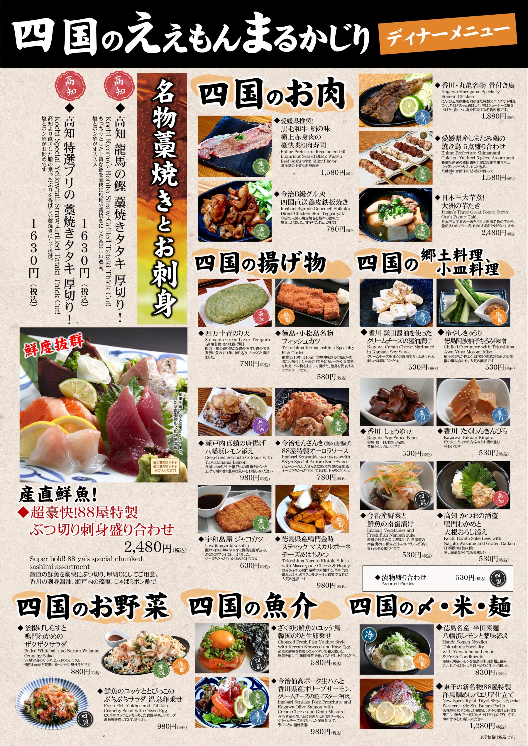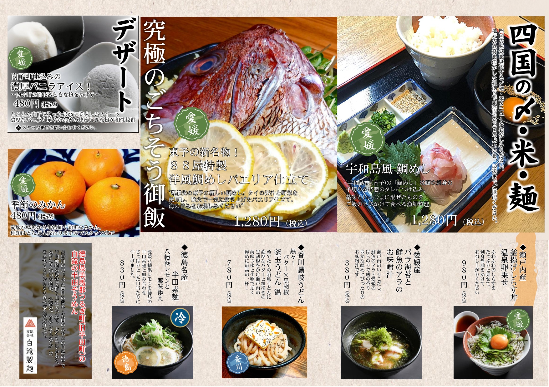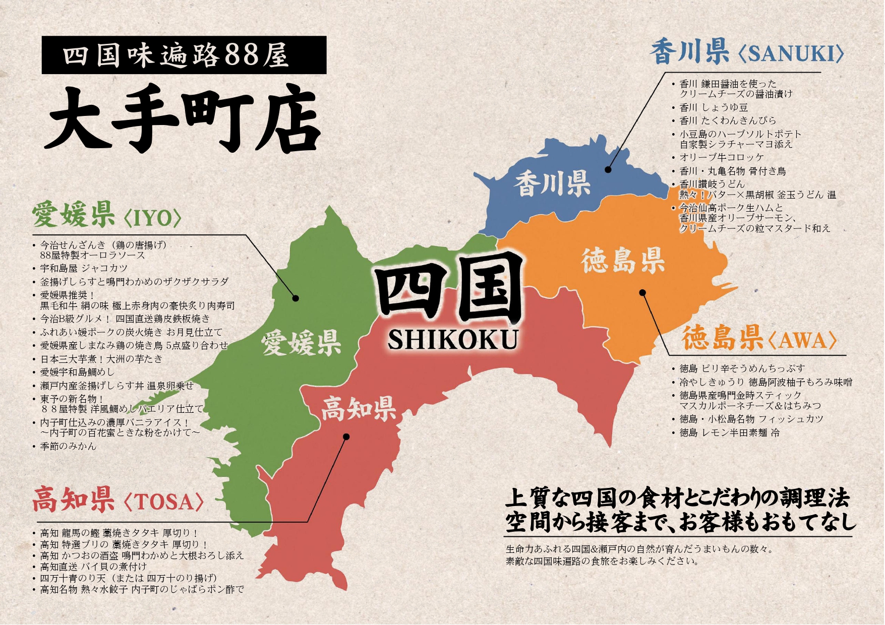♦四国88屋 大手町店のグランドメニュー・ランチメニューを公開いたしました。 四国四県(愛媛・香川・徳島・高知)の