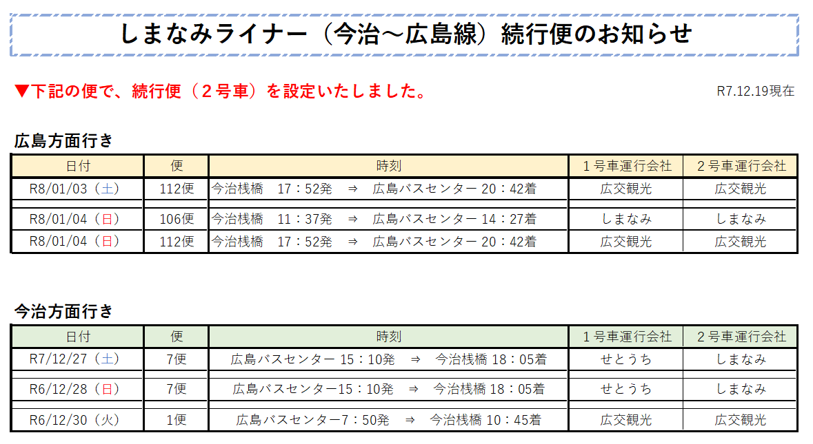 2025.12.16 しまなみライナー今治~広島線 続行便について いつもしまなみバスをご利用いただきまして誠にありがとうございます。 12月27日(土)・28日(日)・30日(火)・1月3日(土)・4日(日)の続行便(2号車)を設定いたしましたので、お知らせします。 ご予約お待ちしております。 PREV NEXT 新着情報一覧へ
